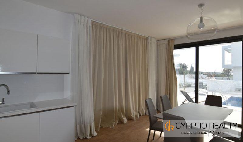 Modern 3 bedroom villa is located in Pyrgos Village, just 5 minutes drive to the beach. Villa is furnished and equipped and consists of 3 bedrooms, 2 bathrooms, guest toilet, open plan kitchen with dining and living areas, veranda. Additional options: new furniture and home appliances, laminate underfloor heating, A/C floors, solar panels, pressure pump, private pool with relax area, parking.