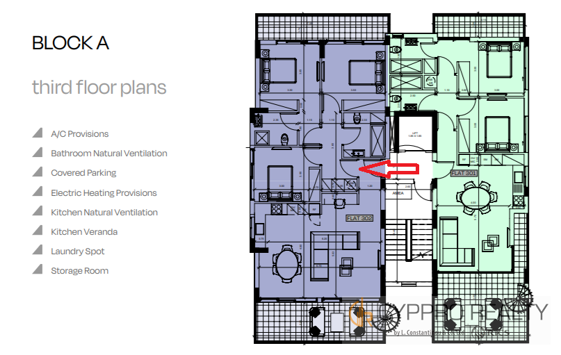 Здание Блок А предлагают выбор из восьми квартир, первый и второй этажи которых состоят из двух уютных квартир с 1 спальней и одной квартиры с 2 спальнями, а третий этаж состоит из одной двухкомнатной квартиры и одной просторной трехкомнатной квартиры. Оба апартамента на З-м этаже имеют сад на крыше.