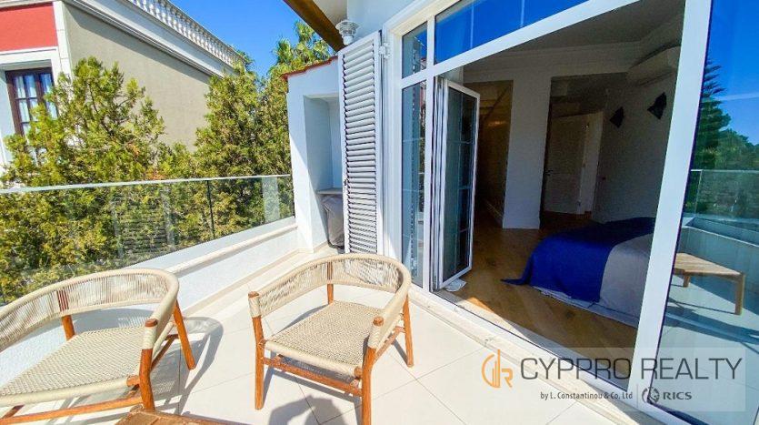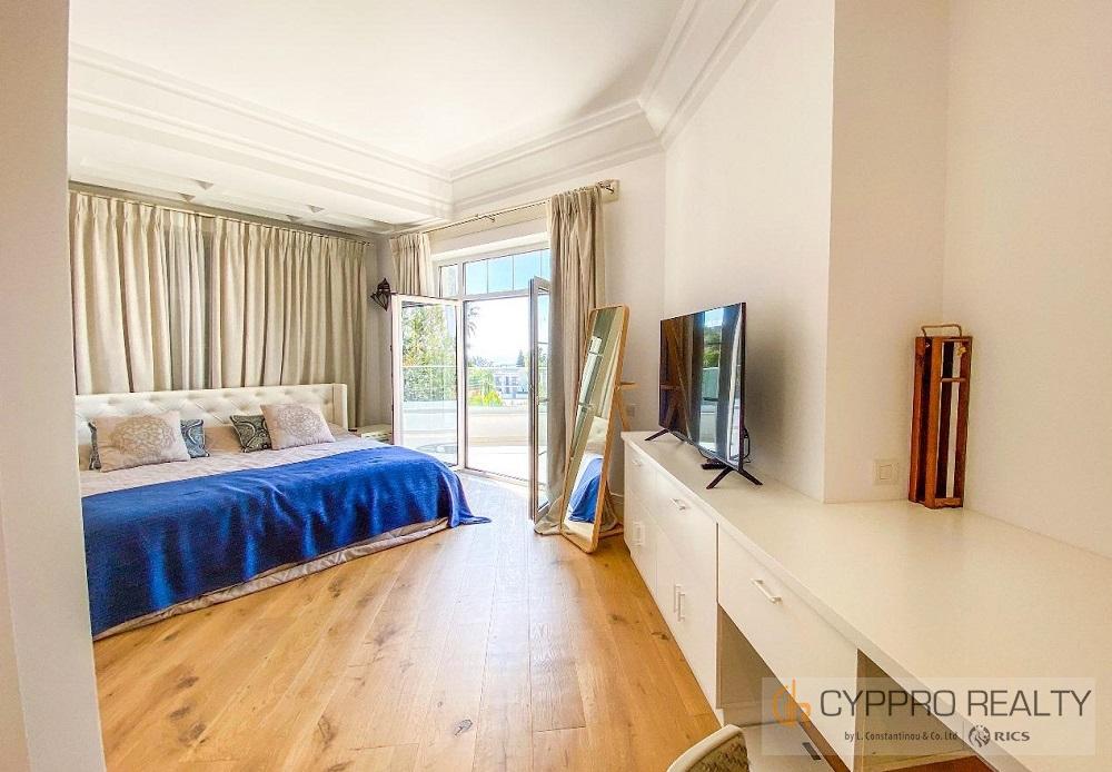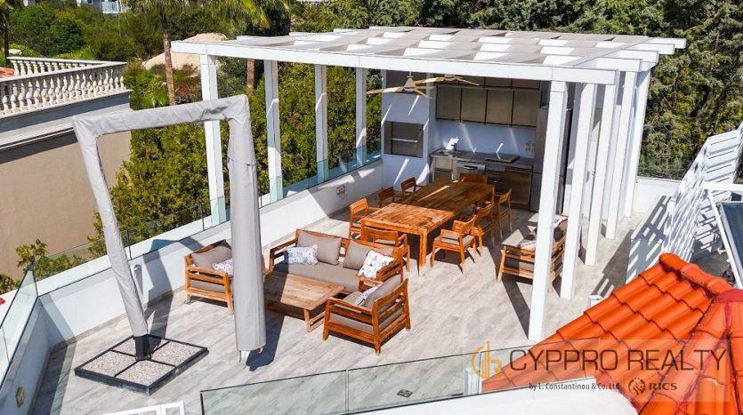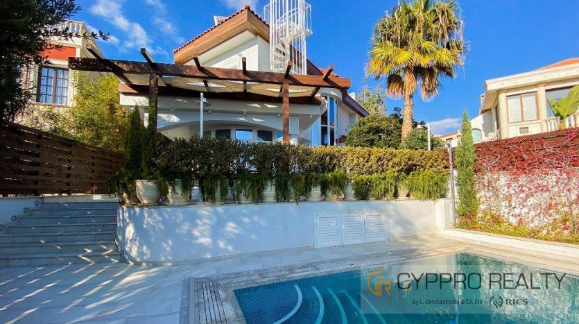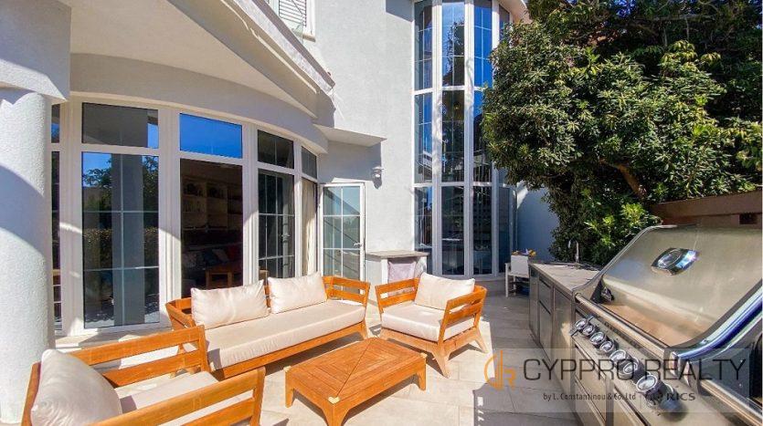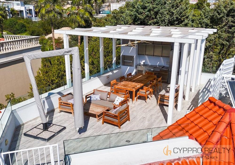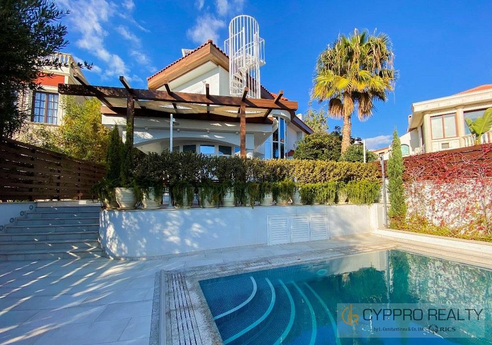 5 bedroom villa for sale in Pyrgos, near Parklane in Limassol. A large covered veranda of 100 m2. Spectacular sea view. The villa is fully furnished and equipped with household appliances. The property is equipped with modern amenities including heating, a private pool and spacious parking spaces. The villa has 3 floors in total. The villa is in a gated complex with functions like alarm and video surveillance.