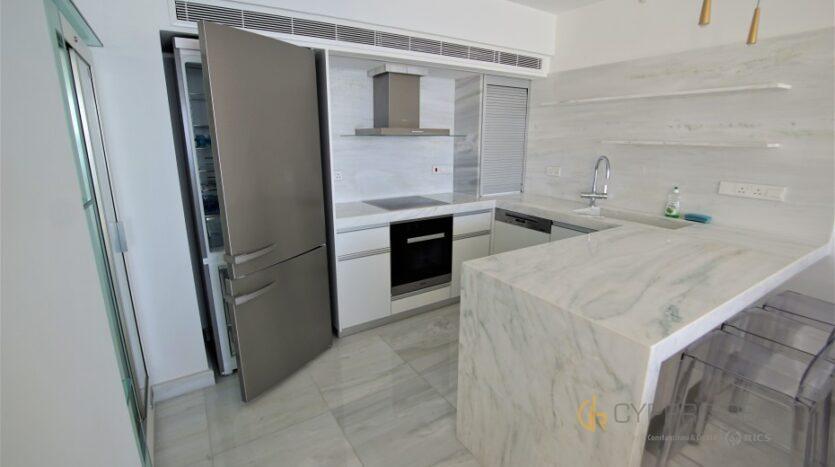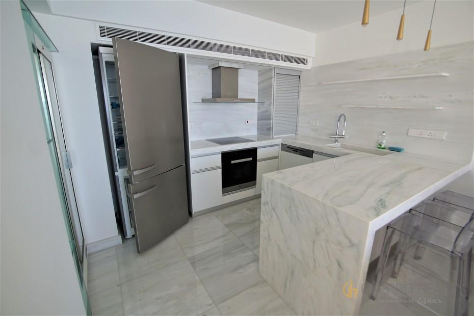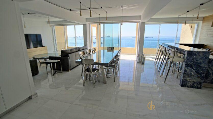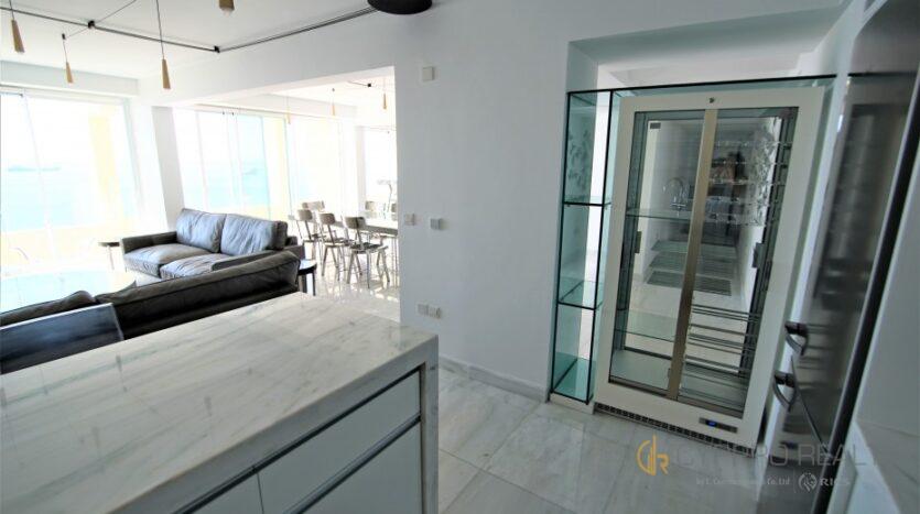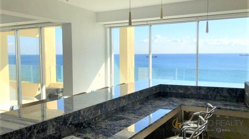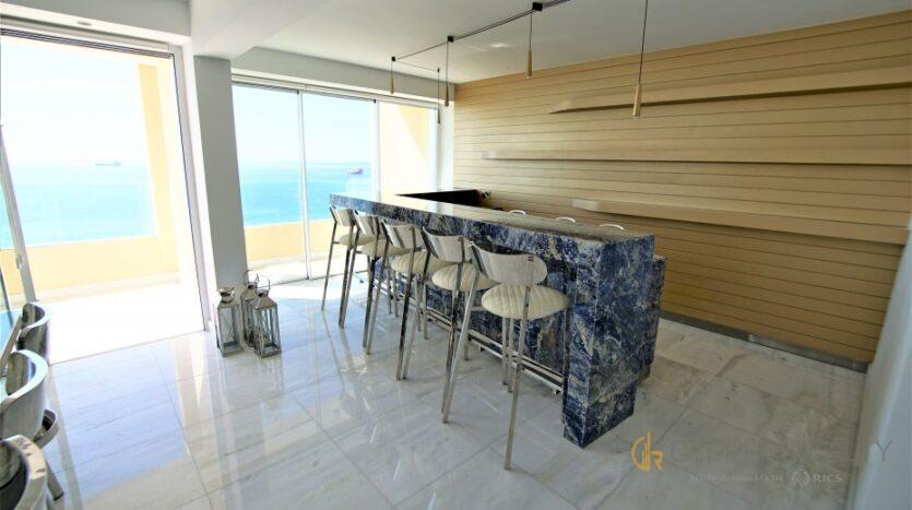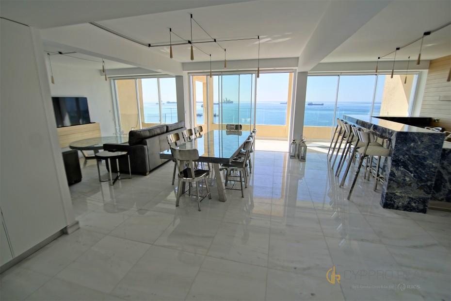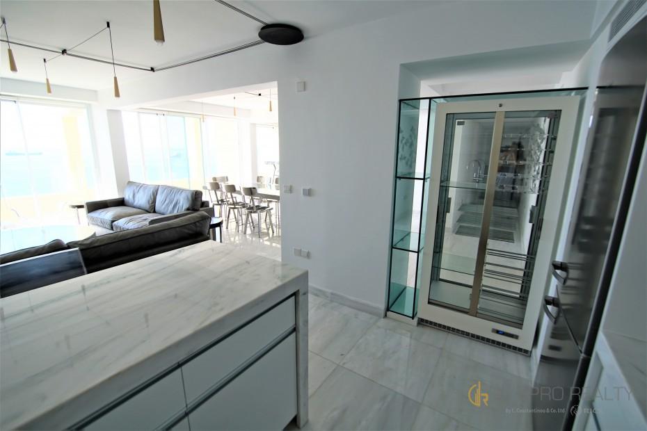 Consist: 3 bedroom (all with their own en-suites), huge open plan space which consists of a fully equipped kitchen with Miele & Bosh appliances, living area, dining area, bar and private covered balcony right in front of the sea. The apartment is on the 7th floor which is the top floor where it offers panoramic views from every corner with its floor to ceiling windows. Offered luxury designed and fully furnished to the highest standards.