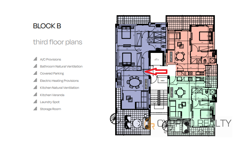 Здание Блок А предлагают выбор из восьми квартир, первый и второй этажи которых состоят из двух уютных квартир с 1 спальней и одной квартиры с 2 спальнями, а третий этаж состоит из одной двухкомнатной квартиры и одной просторной трехкомнатной квартиры. Оба апартамента на З-м этаже имеют сад на крыше.