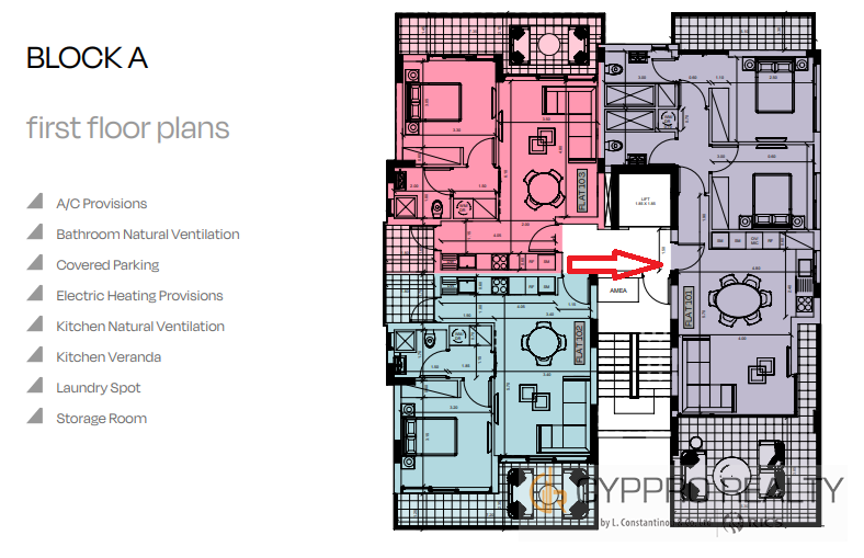 Здание Блок А предлагают выбор из восьми квартир, первый и второй этажи которых состоят из двух уютных квартир с 1 спальней и одной квартиры с 2 спальнями, а третий этаж состоит из одной двухкомнатной квартиры и одной просторной трехкомнатной квартиры. Оба апартамента на З-м этаже имеют сад на крыше.