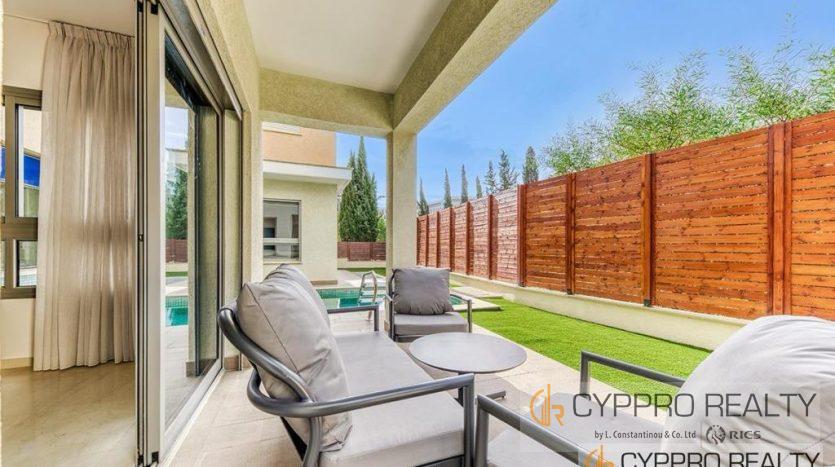 Размер участка около 300 кв.м. На террасе есть бассейн, площадка для барбекю, а также зона для отдыха и загара.