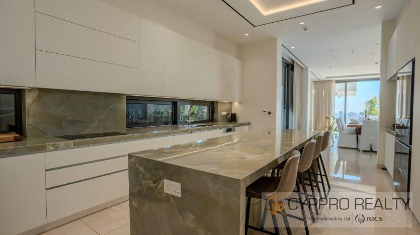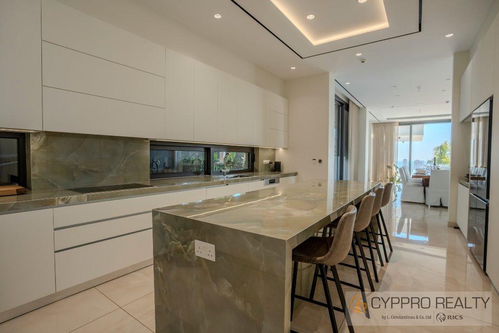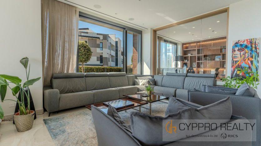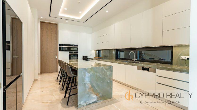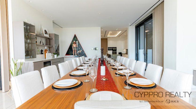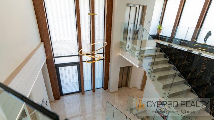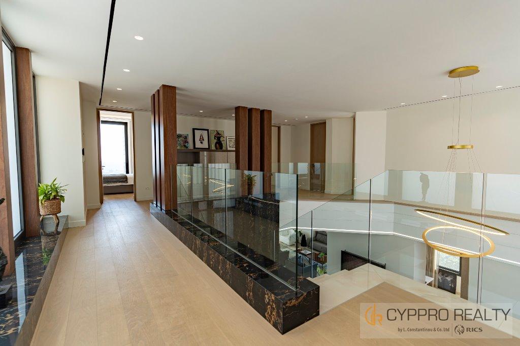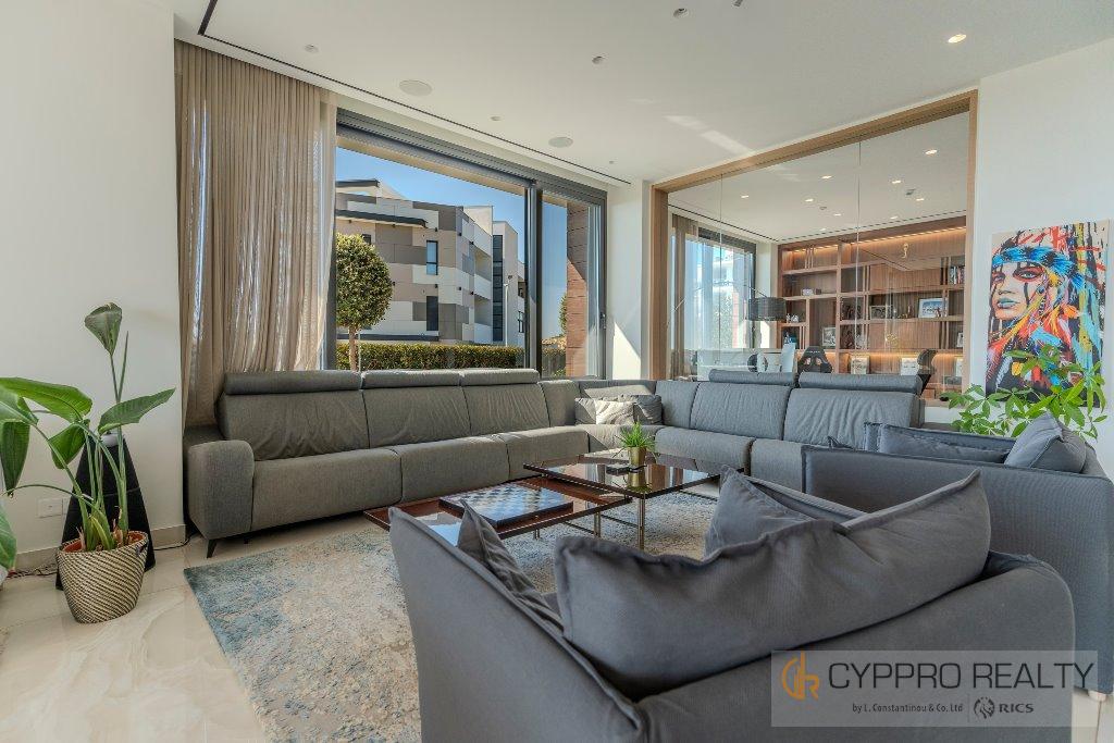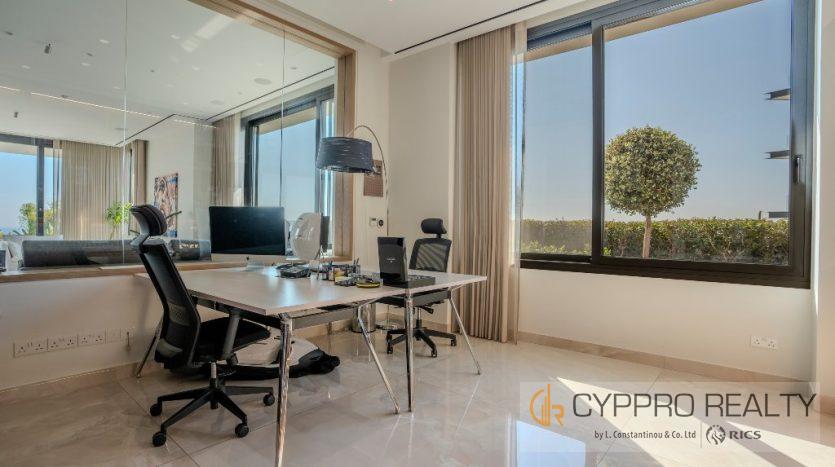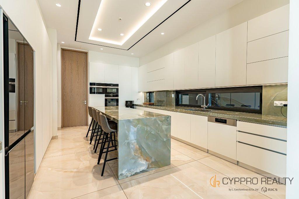 Первый этаж выходит на юг и встречает вас окнами от пола до потолка, из которых открывается великолепный вид на горизонт Лимассола. Здесь также есть официальная приемная, столовая, кухня открытой планировки, просторный кабинет и гостевой туалет. Здесь также есть красивый мраморный камин от пола до потолка, который отделяет столовую от гостиной.