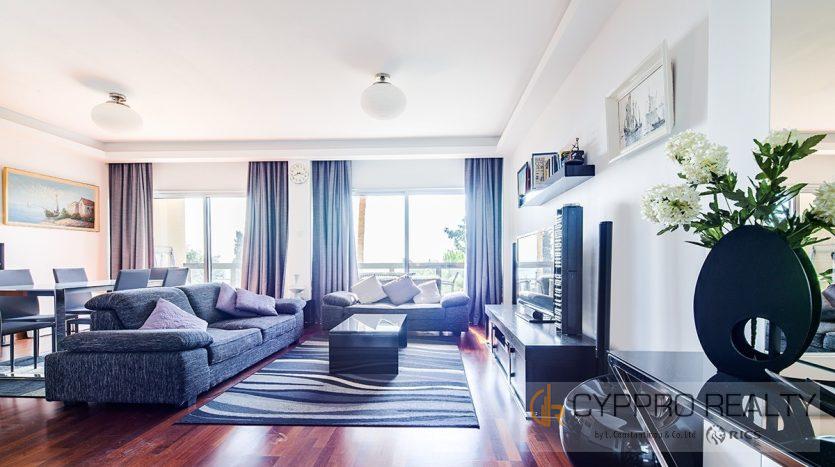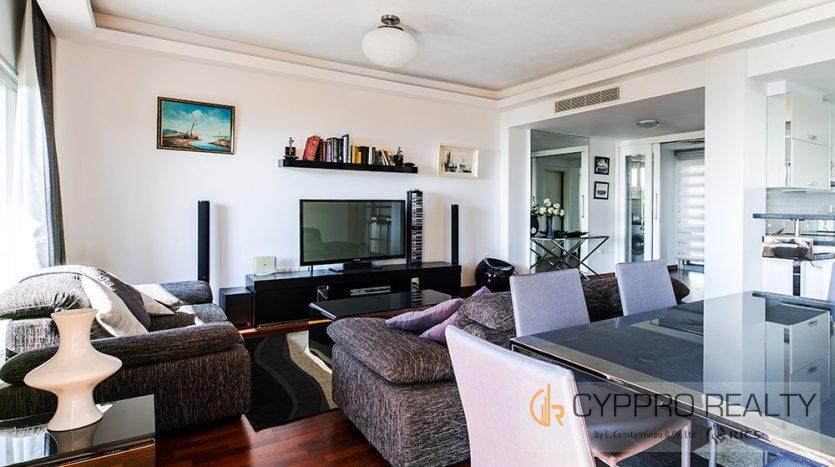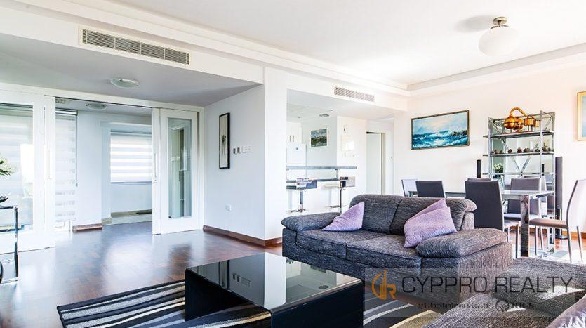 Крытая площадь апартаментов — 189 кв.м. Квартира разделена на 2 зоны: хозяйскую и гостевую. Эти зоны совершенно автономны. Хозяйская зона состоит из гостиной с открытого плана полностью оборудованной кухней, двух спален с видом на море и ванной с джакузи. Большая веранда имеет фронтальный панорамный вид на море. Гостевая зона (автономно расположенная в правом крыле квартиры) имеет одну спальню с санузлом (душ. кабина с гидромассажем), офис (рабочий кабинет) с небольшим балконом и маленькую кухню с раковиной и холодильником.