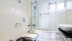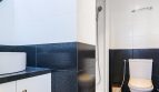 В коридоре, объединяющем две зоны, находятся прихожая и гостевой санузел с душем.
