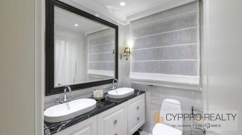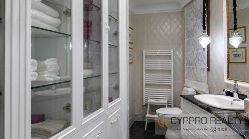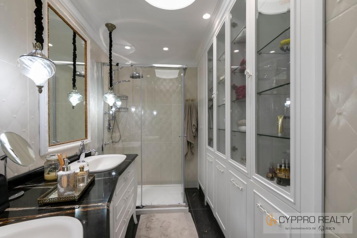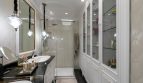 Изготовление на заказ и ручной работы мебели, ковров, светильников и штор. Две раковины в ванной комнате с душевой кабиной, много витрины и места для хранения в сделанных на заказ шкафах.