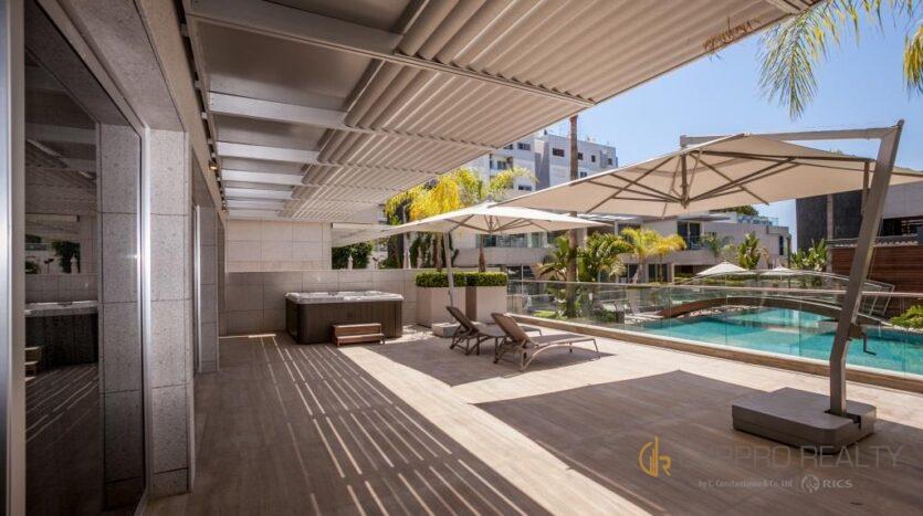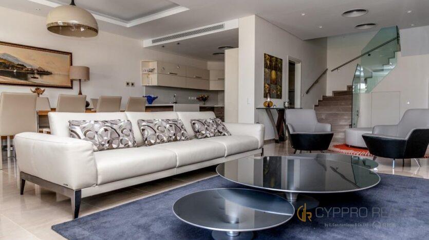 Роскошные двухуровневые апартаменты с тремя спальнями и видом на море расположены в закрытом комплексе на первой линии моря в районе Потамос Гермасойяс, в пешей доступности до всех удобств.