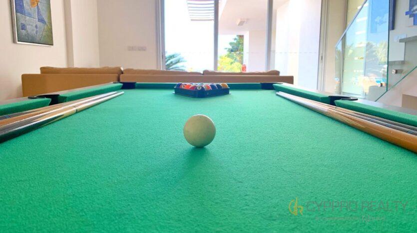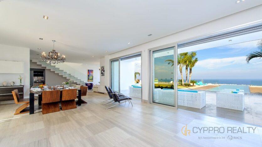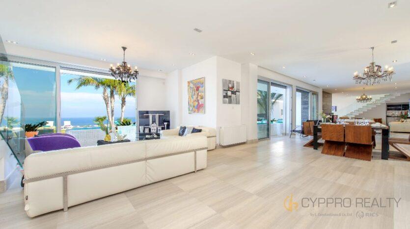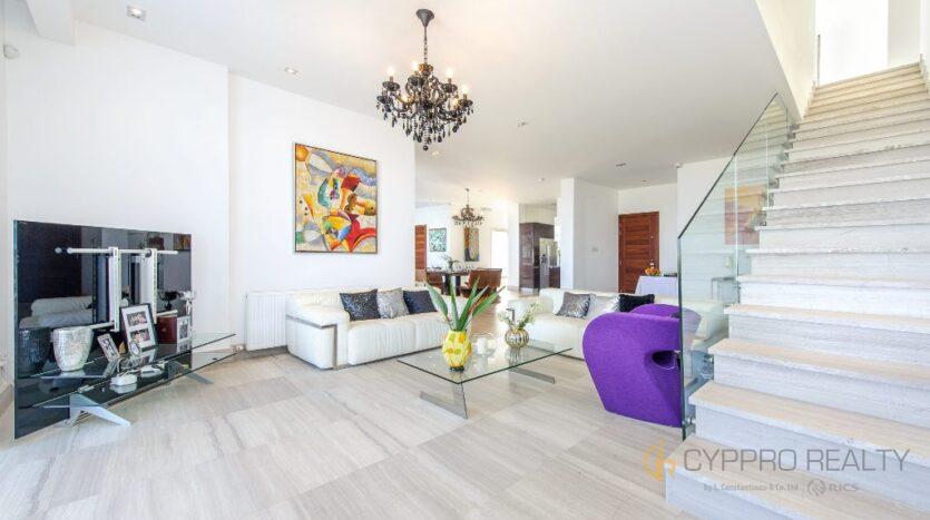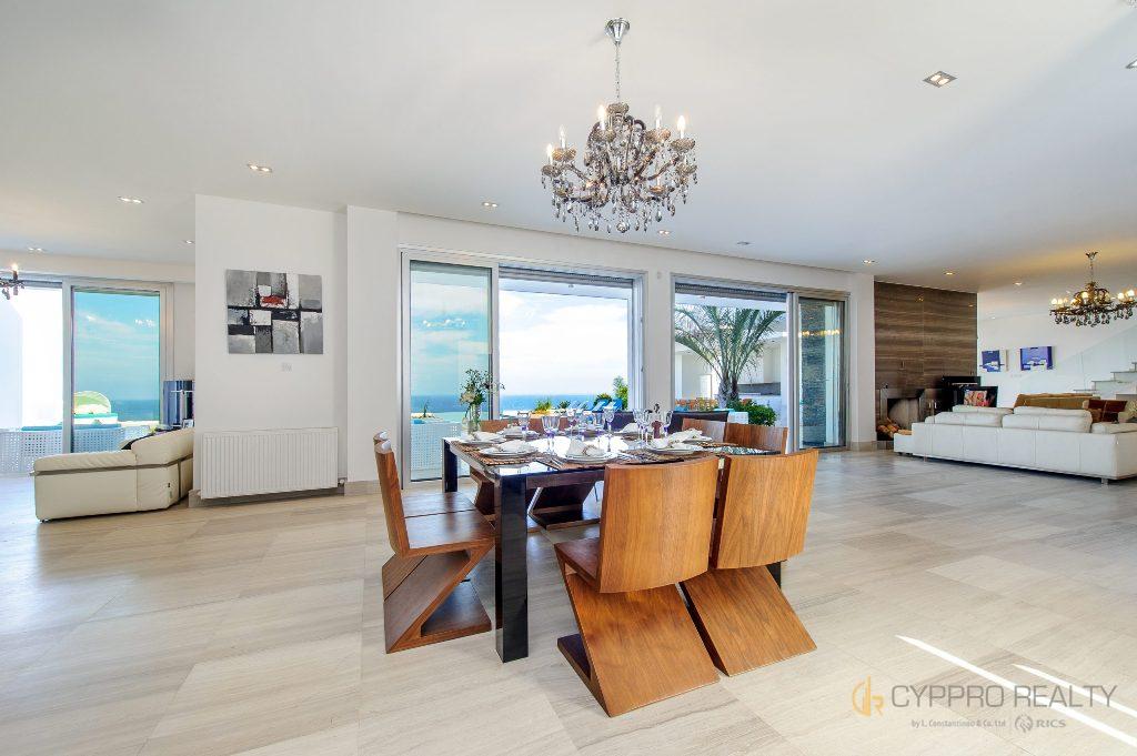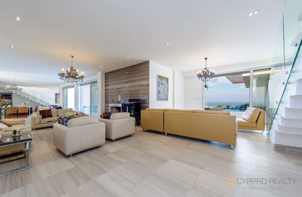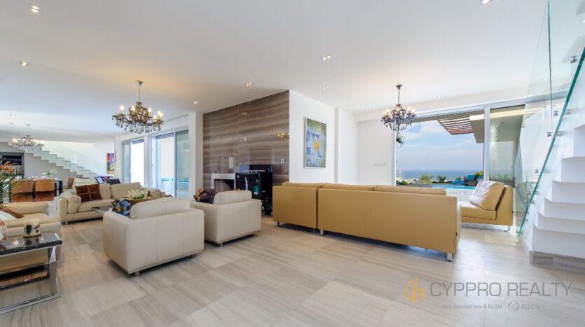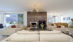 3 большие гостиные с диванами, телевизорами и одним камином, 3 оборудованные кухни и 3 дополнительных туалета помимо спален с ванными комнатами.